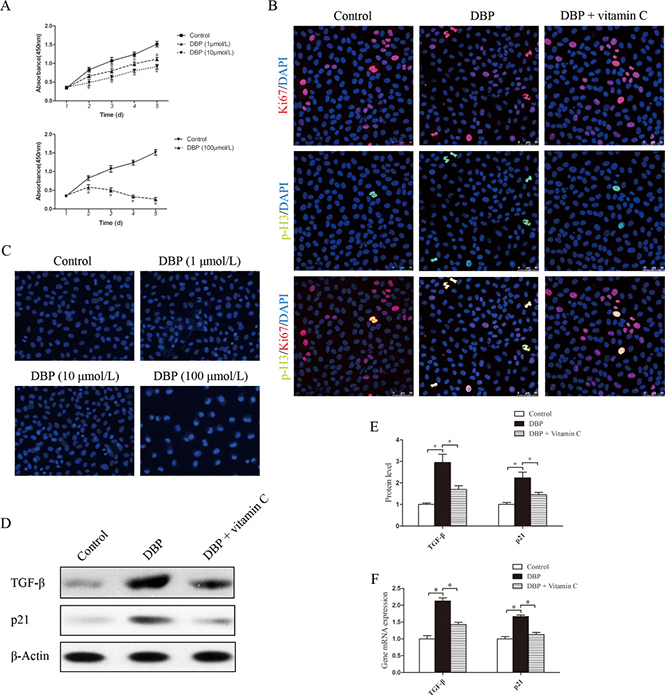 Figure 4: DBP inhibits NRK52E cell growth and induces G2/M arrest and the overproduction of TGF-β in NRK52E cells at a sublethal dose. (A) CCK-8 cell proliferation assays showing different proliferation between NRK52E cells exposed to various concentrations of DBP (1, 10, 100 μmol/L). (B) Dual immunofluorescence of Ki67 (red) and p-H3 (green) in NRK52E cells of DBP-exposed, vitamin C-exposed group and unexposed controls. DAPI (blue) was used for nuclear staining. (C) Hoechst 33342 dye stained images of NRK52E cells exposed to various concentrations of DBP (1, 10, 100 μmol/L). (D) Western blot showing different TGF-β and p21 protein levels of NRK52E cells in DBP-exposed, vitamin C-exposed group and unexposed controls. (E) Densitometric quantification of TGF-β and p21 protein levels of NRK52E cells in DBP-exposed, vitamin C-exposed group and unexposed controls. (F) Real-time PCR assessed the expression of TGF-β (Tgfb) and p21(Cdkn1a) of NRK52E cells in DBP-exposed, vitamin C-exposed group and unexposed controls. Data represent mean ± SD. n = 6 rats per group, *P < 0.05.
