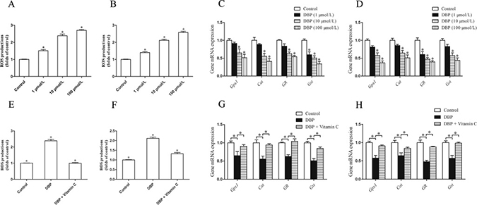 Figure 5: DBP generates oxidative stress and reduces the expression of the gene responsible for the prevention of oxidative activity in NRK49F and NRK52E cells. (A) Measurement of intracellular ROS in NRK49F cells by DCFH-DA dye showed the quantity of ROS increased significantly after treatment with various concentrations of DBP (1, 10, 100 μmol/L). (B) Measurement of intracellular ROS in NRK52E cells by DCFH-DA dye showed the quantity of ROS increased significantly after treatment with various concentrations of DBP (1, 10, 100 μmol/L). (C) Real-time PCR assessed the expression of antioxidant genes (Gpx1, Cat, GR, Gst) of NRK49F cells exposed to various concentrations of DBP (1, 10, 100 μmol/L). (D) Real-time PCR assessed the expression of antioxidant genes (Gpx1, Cat, GR, Gst) of NRK52E cells exposed to various concentrations of DBP (1, 10, 100 μmol/L). (E) Measurement of intracellular ROS by DCFH-DA dye in NRK49F cells in DBP-exposed, vitamin C-exposed group and unexposed controls. (F) Measurement of intracellular ROS by DCFH-DA dye in NRK52E cells in DBP-exposed, vitamin C-exposed group and unexposed controls. (G) Real-time PCR assessed the expression of antioxidant genes (Gpx1, Cat, GR, Gst) of NRK49F cells in DBP-exposed, vitamin C-exposed group and unexposed controls. (H) Real-time PCR assessed the expression of antioxidant genes (Gpx1, Cat, GR, Gst) of NRK52E cells in DBP-exposed, vitamin C-exposed group and unexposed controls. Data represent mean ± SD. n = 6 rats per group, *P < 0.05.