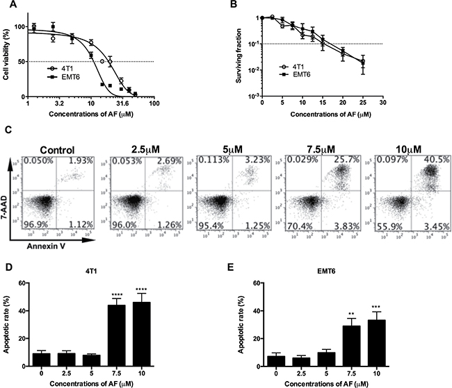 Figure 1: AF caused apoptosis and cytotoxicity in mouse tumor cells. (A) Tumor cells were treated with AF for 2 h with indicated concentrations, and one day later analyzed for cell viability by MTT assay. Data are shown as mean ± SD (n = 3). (B) Following the same treatments, cell viability was analyzed by an 8-day colony formation assay. Data are shown as mean ± SD (n = 3). (C) Representative scatter plots of apoptosis in 4T1 cells, after AnnexinV/7-AAD staining and assessment by flow cytometry. (D) Summarized data on AF-induced apoptosis in 4T1 and (E) EMT6 tumor cells. Data are shown as mean ± SD (n ≥ 3). One-way ANOVA with Bonferonni’s multiple comparison test was used to calculate statistics: *p < 0.05, **p < 0.01, ***p < 0.001, ****p < 0.0001.