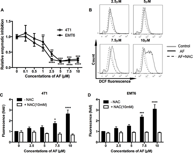It is well accepted that AF elicits cytotoxicity mainly due to its inhibitory effect on TrxR resulting in an overload ROS [23, 24]. Therefore, first, we assessed the ability of AF to inhibit TrxR activity in 4T1 and EMT6 cells (Figure 2A). The inhibitory effects in both cell lines were evident above 1 μM with a profound inactivation of TrxR at 5–10 μM (Figure 2A). Next, the intracellular redox status was evaluated through ROS generation using the fluorescent probe CM-H2DCFDA. As shown in Figure 2B–2D (and Supplementary Figure 2B), ROS production was induced in a dose-dependent manner and was significantly upregulated at 7.5 (*p < 0.05 and ***p < 0.001) and 10 μM (****p < 0.0001) in 4T1 and EMT6 cells respectively, according to the shift in DCFDA signal. Apparently, the inhibition of TrxR by AF occurs at relatively lower concentrations than those causing a considerable increase in ROS, suggesting that other antioxidative systems (such as GSH) may display compensatory effects. Finally, the importance of ROS production in observed effects was confirmed by using NAC, a thiol-reducing antioxidant agent. Pretreatment of 4T1 and EMT6 cells with NAC for 1 h at 10 mM effectively attenuated the ROS overproduction caused by AF, as shown in Figure 2B–2D further detailed in Supplementary Figure 2B. In addition, NAC counteracted AF-induced cytotoxicity (data not shown), indicating that ROS production and cytotoxicity are linked.