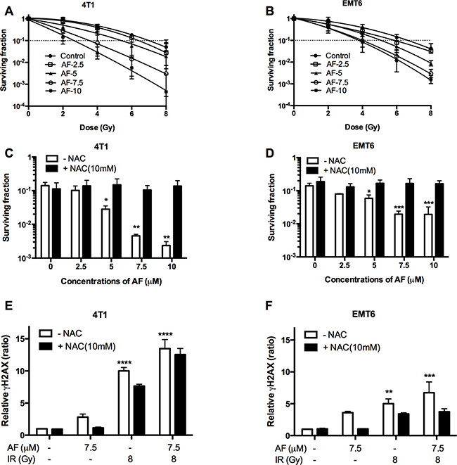 Figure 3: AF radiosensitized aerobic tumor cells and enhanced radiation induced DNA damage. 4T1 and EMT6 cells were treated with AF for 2 h at indicated concentrations, while NAC (10 mM) was added 1 h prior and during treatment. (A–B) The radiosensitizing effect of AF was assessed by colony formation assay. Data are shown as mean ± SD (n = 3). (C–D) Counteracting effect of the ROS scavenger NAC at 6 Gy. (E–F) Double-strand DNA breaks were analyzed by flow cytometry using the γH2AX-based foci measurements. Data are shown as mean ± SD (n ≥ 3). One-way ANOVA with Bonferonni’s multiple comparison test was used to calculate statistics: *p < 0.05, **p < 0.01, ***p < 0.001, ****p < 0.0001.
