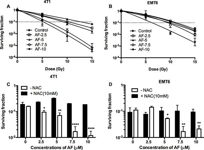 Figure 4: AF radiosensitized hypoxic tumor cells. 4T1 cells were treated with AF for 2 h at indicated concentrations, while NAC (10 mM) was added 1 h prior and during treatment. To assess hypoxic radiosensitivity, subconfluent cultures were irradiated in a metabolic hypoxia model TMCS. (A–B) Radiosensitizing effect of AF was assessed by colony formation assay. Data are shown as mean ± SD (n = 3). (C–D) Counteracting effect of the ROS scavenger NAC at 10 Gy. Data are shown as mean ± SD (n ≥ 3). One-way ANOVA with Bonferonni’s multiple comparison test was used to calculate statistics: *p < 0.05, **p < 0.01, ***p < 0.001, ****p < 0.0001.