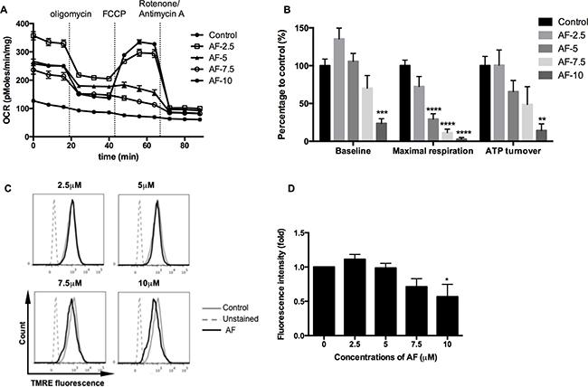 Figure 5: AF induced mitochondrial dysfunction in tumor cells. 4T1 cells were treated with AF for 2 h at indicated concentrations and the respiratory profiles were examined by a Seahorse Analyzer. (A) Dissection of respiratory rates by the sequential injection of oligomycin, FCCP, rotenone and antimycin A at indicated time points. (B) Summarized data on the baseline respiratory rate, maximum respiratory capacity and ATP turnover. Data are shown as mean ± SD (n = 5). (C–D) Representative measurements of ΔΨm in 4T1 cells by flow cytometry and summarized data on membrane potential. Data are shown as mean ± SD (n = 3). One-way ANOVA with Bonferonni’s multiple comparison test was used to calculate statistics: *p < 0.05, **p < 0.01, ***p < 0.001, ****p < 0.0001.