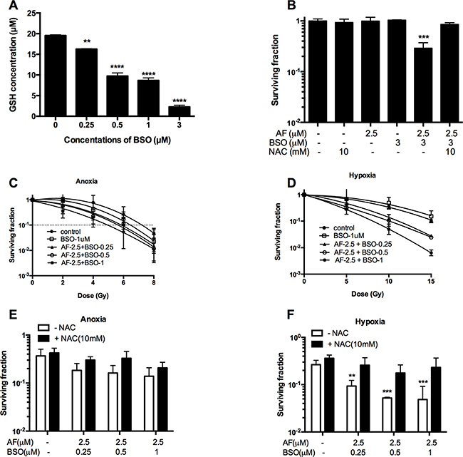 Figure 6: BSO potentiated AF-induced radiosensitization in tumor cells. 4T1 cells were exposed to AF and/or BSO at indicated concentrations for 2 and 16 h respectively. (A) Depletion of glutathione by BSO in 4T1 cells. Data are shown as mean ± SD (n ≥ 3). (B) Synergistic cytotoxicity of AF combined with BSO applied at non-cytotoxic concentrations. Data are shown as mean ± SD (n ≥ 3). (C–D) Aerobic and hypoxic radiosensitization by AF combined with BSO, as measured by colony formation assay. Data are shown as mean ± SD (n = 3). (E–F) Counteracting effect of the ROS scavenger NAC under aerobic and hypoxic conditions respectively. Data are shown as mean ± SD (n = 3). One-way ANOVA with Bonferonni’s multiple comparison test was used to calculate statistics: *p < 0.05, **p < 0.01, ***p < 0.001, ****p < 0.0001.