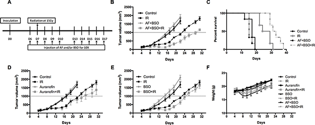 Figure 7: AF combined with BSO enhanced the radioresponse of 4T1 tumor in Balb/c mice. AF and BSO were administered subcutaneously for 10 times to tumor-bearing mice, and single dose radiation at 15 Gy was delivered on the second day of treatment. (A) Experimental scheme depicting used treatment protocols. (B) Tumor growth in mice treated with radiation and the combination of AF (3 mg/kg) and BSO (25 mg/kg). (C) Survival curves of mice euthanized at a diameter of 15 mm. (D) Tumor growth in mice treated with radiation and AF only. (E) Tumor growth in mice treated with radiation and BSO only. (F) Assessment of toxicity by body weight loss.
