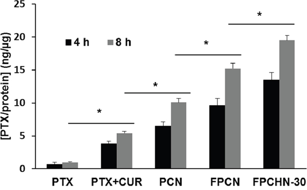 The quantitative cellular uptake of paclitaxel from the different formulations was presented in Figure 3. From the results, the co-treatment of paclitaxel and curcumin exhibited increased uptake of paclitaxel compared to that of paclitaxel alone. In addition, encapsulation of both drugs in nanoparticles allowed for enhanced uptake of paclitaxel compared to free paclitaxel and curcumin. Furthermore, FA-conjugation allowed for further enhancement of cellular uptake of paclitaxel by receptor-mediated uptake. Figure 3 shows that the uptake of paclitaxel of free paclitaxel+curcumin, PCN, FPCN and FPCHN-30 were higher than that of free paclitaxel. Except free paclitaxel, all of formulations exhibited time-dependent uptake of paclitaxel in MCF-7/ADR cells. At 8 h, co-treatment of curcumin and paclitaxel (free paclitaxel+curcumin) showed significant higher uptake of paclitaxel (5.1 ± 0.3 ng/μg) compared to that of free paclitaxel (1.1 ± 0.1 ng/μg). Further enhanced cellular uptake of paclitaxel (10.2 ± 0.8 ng/μg) was achieved by encapsulation of drugs in nanoparticles (PCN). Folate-conjugation of PCN (FPCN) also exhibited significant increment of internalized paclitaxel (14.9 ± 1.3 ng/μg) compared to that of non-conjugated PCN. Notably, FPCHN-30 exhibited the highest cellular paclitaxel uptake (19.1 ± 1.1 ng/μg) among the tested formulations and 1.44 times higher than that of FPCN.