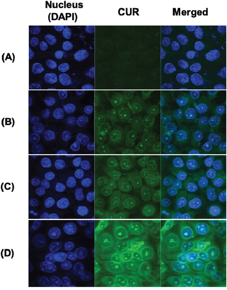 For cellular uptake of curcumin, the cells were incubated on glass base dish (Thermo scientific, USA) and were examined by confocal laser scanning microscopy (CLSM, Model: LSM5LIVE; Carl Zeiss, Wetzlar, Germany). In glass base dish, MCF-7/ADR cells were seeded at a density of 1 x 106 cells per well in 1 mL of growth medium and incubated for 24 h to allow them to attach. The cells were then treated with the different formulations in growth medium. At predetermined time point (4 h), the cells were washed three times with cold PBS. Then, cells were stained with 1 μg/mL DAPI in PBS for 3 min and washed twice with PBS. The cells were observed directly under the CLSM.