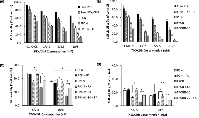 In order to confirm the enhanced cellular uptake of paclitaxel and curcumin, cell cytotoxicity was measured by MTT assay. All the formulations exhibited higher cytotoxicity as compared to that of free paclitaxel and curcumin. In addition, folate conjugation onto surface of NPs allowed for further cytotoxicity. It was highlighted that FPCHN-30 exhibited still higher cytotoxicity compared to that of FPCN when the NPs were co-incubated with folate. FPCHN-30, rate-controlling and active-targeting delivery system, exhibited the highest cytotoxicity as well as cellular uptake on MCF-7/ADR cells.