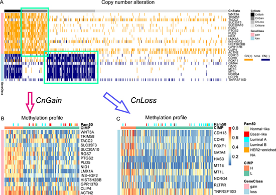 The distribution of the breast cancer luminal A phenotype in CIMP-L tended to differ between CnGain and CnLoss samples. Such enrichment may due to the large portion of luminal A samples, so more information related to those molecular phenotypes may need to be added in further analysis to check out the tendency in this study. Particularly, the CnGain samples retained more CIMP-H samples than CnLoss, implying that copy number gain might correlate with hypermethylation in our markers. In all, the combination of methylation and CNA may shed lights on mechanisms of CIMP and facilitate more accurate cancer risk assessment, detection and outcome prediction.