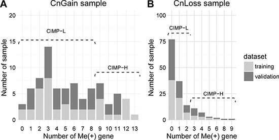 The methylation values of 15 CN gain and 10 CN loss markers were used to classify CIMP status of CnGain and CnLoss samples. Different threshold, 0.45 and 0.6 (larger than the 3rd quantile) were used to evaluate the methylation status of CN gain and CN loss genes, separately. If the methylation value was larger than the threshold, the gene was marked as Methylation (+) (Me (+)). CIMP-H tumors were defined as having at least 9 Me (+) in 15 CN gain genes for CnGain samples, and at least 3 Me (+) genes in 10 CN loss genes for CnLoss samples.