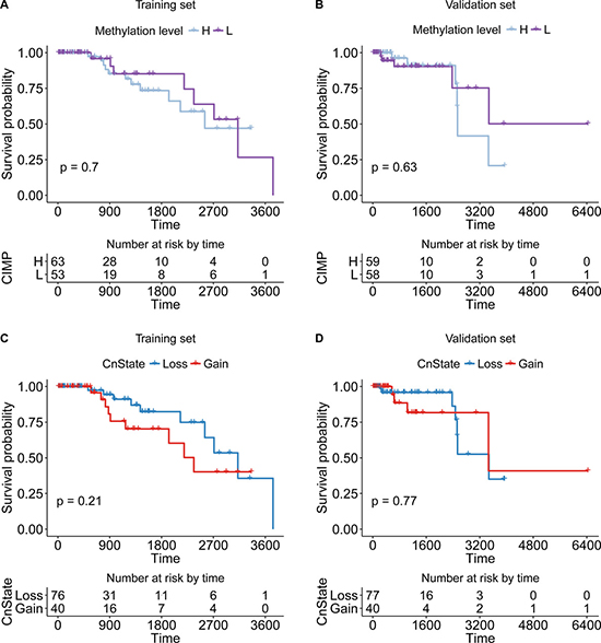 CIMP-H/L classification only using methylation information was achieved with hierarchical clustering of methylome characterized by the 601 most variant probes (Ward-D2, Euclidean distance). The datasets were divided into two equal parts for training and validation. The Survival analysis employing the Kaplan–Meier product limit estimator and log rank tests were performed to compare the likelihood of disease-related death of different CIMP cohorts. The multivariate Cox proportional hazard models were fitted to check the survival risks of CIMP types, and covariates included age, tumor stage, etc. Student’s t-test was used to compare the distribution of methylation levels between copy number gain and copy number loss genes. Chi-square (Fisher test when sample number less than 5) was used to check the distribution difference of molecular phenotypes in CIMP-H/L samples in CnGain/Loss status. All statistical tests were two sided and plots were performed by R program (version 3.2.2).
