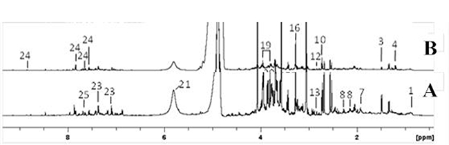Figure 2: 1H NMR spectra (δ0.5-9.0) of urine samples obtained from group (A and B). Keys: 1: octanoate; 3: alanine; 4: 4-ethylphenol; 7,acetate, 8,N-acetylglutamate; 10,dimethylamine; 12,N,N-dimethylglycine; 13,sarcosine; 16, trimethylamine N-oxide; 19,phenylacetylglycine; 21,urea; 23,p-cresol glucuronide; 24,hippurate; 25,pseudouridine.