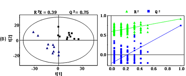 Figure 5: PLS-DA scores plots (left panel) derived from 1H NMR spectra of urine samples obtained from group (A and group B) and cross validation (right panel) by permutation test. Note: group A: black box (■); group B: blue triangle (▲).