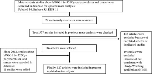 Figure 1: Flow chart illustrating the search strategy used for this meta-analysis to identify studies that examined the association between hOGG1 Ser326Cys polymorphism and risk of cancer.