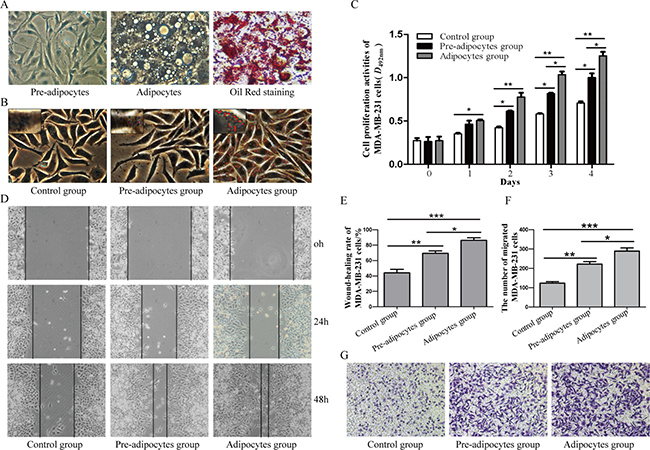 Figure 1: Different effects of pre-adipocytes and adipocytes on the biological behaviors of MDA-MB-231. (A) Adipocytic differentiation of 3T3-L1 pre-adipocytes and Oil Red staining of mature adipocytes after differentiation induction (×400). (B) Oil Red staining of MDA-MB-231 cells (×400). (C) MTT assay was performed to detect the proliferation of MDA-MB-231 cells(*P < 0.05, **P < 0.01, vs control group). Result showed that pre-adipocytes and adipocytes could promot the proliferation of MDA-MB-231 cells. (D) and (E) Cell migration was evaluated by wound-closure assay (×100; *P < 0.05, **P < 0.01, ***P < 0.001, vs control group). F and G. The migration of MDA-MB-231 cells was evaluatedby transwell migration assay (×100; *P < 0.05, **P < 0.01, ***P < 0.001, vs control group). *P < 0.05, **P < 0.01, ***P < 0.001; vs control group. Control group: MDA-MB-231; Pre-adipocytes group: MDA-MB-231+ pre-adipocytes; Adipocytes group: MDA-MB-231+ adipocytes.