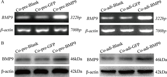 Figure 2: BMP9 expression in MDA-MB-231cells ofthe co-culture system was detected by RT-PCR and Western blotting. (A) mRNA expression of BMP9 was detected by RT-PCR. (B) Protein expression of BMP9 was detected by Western blotting. Co-pre-Blank: MDA-MB-231 + pre-adipocytes; Co-pre-GFP: MDA-MB-231/AdGFP + pre-adipocytes; Co-pre-BMP9: MDA-MB-231/AdBMP9 + pre-adipocytes; Co-adi-Blank: MDA-MB-231 + adipocytes; Co-adi-GFP: MDA-MB-231/AdGFP + adipocytes; Co-adi-BMP9: MDA-MB-231/AdBMP9 + adipocytes.