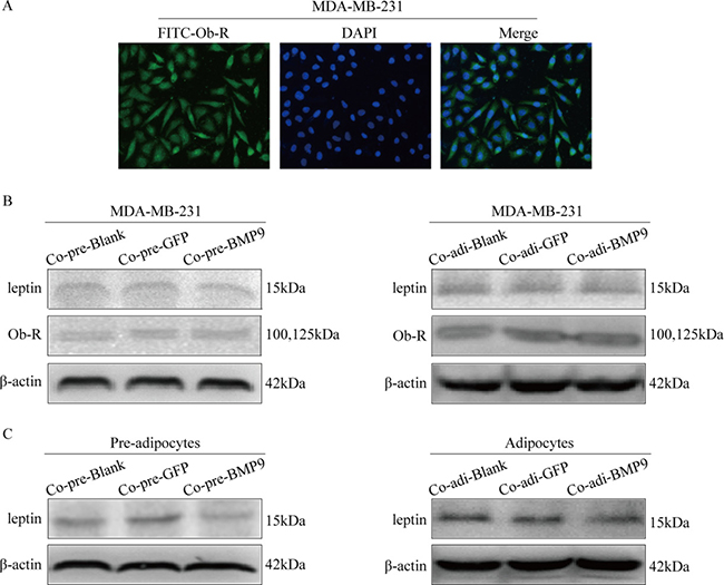 Figure 4: Effect of BMP9 on the expression of leptin and ObR in the co-culture system. (A) The ObR expression in MDA-MB-231 cells was detected by immunofluorescence staining (×400). (B) The effect of BMP9 on the expression of leptin and ObR in MDA-MB-231 cells was detected by Western blotting. (C) The effect of BMP9 on the expression of leptin in pre-adipocytes or adipocytes was evaluated by Western blotting. All experiments were performed in triplicate. BMP9 had no effect on the expression of leptin and Ob-R of MDA-MB-231 cells, but inhibited the expression of leptin in the pre-adipocytes and adipocytes. Co-pre-Blank: MDA-MB-231 + pre-adipocytes; Co-pre-GFP: MDA-MB-231/AdGFP + pre-adipocytes; Co-pre-BMP9: MDA-MB-231/AdBMP9 + pre-adipocytes; Co-adi-Blank: MDA-MB-231 + adipocytes; Co-adi-GFP: MDA-MB-231/AdGFP + adipocytes; Co-adi-BMP9: MDA-MB-231/AdBMP9 + adipocytes.