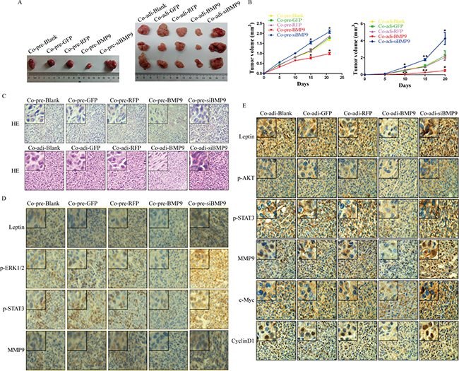 Figure 6: Antitumor effect of BMP9 in vivo. (A) Tumors were collected from all groups. (B) Tumor growth curve of different groups. Results showed BMP9 inhibited the growth of MDA-MB-231 cells in vivo. (C) Hematoxylin-eosin staining of the tumors in different groups (×400). (D) and (E) Immunohistochemistry of tumors in different groups (×400). Co-pre-Blank: MDA-MB-231 + pre-adipocytes; Co-pre-GFP: MDA-MB-231/AdGFP + pre-adipocytes; Co-pre-RFP: MDA-MB-231/AdRFP + pre-adipocytes; Co-pre-BMP9: MDA-MB-231/AdBMP9 + pre-adipocytes; Co-pre-siBMP9: MDA-MB-231/AdsiBMP9 + pre-adipocytes; Co-adi-Blank: MDA-MB-231 + adipocytes; Co-adi-GFP: MDA-MB-231/AdGFP + adipocytes; Co-adi-RFP: MDA-MB-231/AdRFP + adipocytes; Co-adi-BMP9: MDA-MB-231/AdBMP9 + adipocytes; Co-adi-siBMP9: MDA-MB-231/AdsiBMP9 + adipocytes.
