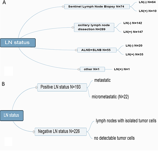 Histopathologic information, including the progesterone receptor status, histological grade, ER status, HER-2, Ki-67 (Ki67 ≤ 14% was defined as low expression and Ki67 > 14% as high expression [32–34]), tumor size, lymphovascular invasion (IVI) and LN status (number of ALND, ALND(+), number of SLNB, SLNB(+) and micrometastasis), were obtained from the pathology reports.