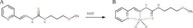 We recently reported on the identification of the thiosemicarbazone 3-(3-methoxypropyl)-1-[[(pyridin-2-yl)methylidene]amino]thiourea (CD 02750, subsequently denoted VLX50) (Figure 1A) as a hit in a phenotype-based drug screen and found it to be active against ovarian carcinoma cells both in vitro and in vivo [5]. Confirmed by a series of experiments this drug was shown to deplete intracellular iron, leading to hypoxia signaling. In the present study, our aim was to develop VLX50 and rationally design a more potent drug with enhanced anticancer activity and explore its mechanism of action. Therefore, we synthesized a copper complex (Copper(II) chloride complex of 3-(3-methoxypropyl)-1-[[(pyridin-2-yl)methylidene]amino]thiourea) of VLX50 (the copper complex subsequently denoted VLX60; Figure 1B) and investigated its antitumor and mechanistic properties in various models, including xenografts in mice.