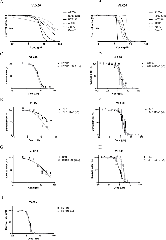 Figure 2: (A–B) Cell survival in the FMCA assay, expressed as survival index of cell lines cultured as monolayers when exposed to VLX50 or VLX60 for 72 h. Concentration-response curves are based on two to six independent experiments with duplicate or triplicate wells for each concentration. Standard error bars are omitted for clarity. (C–H) Antitumor activity of VLX50 and VLX60 in three isogenic cell models of colon cancer. The parental cells harbor KRAS or BRAF mutations that are knocked out in the KRAS/BRAF sublines. Concentration-response curves are based on four to eight independent experiments, with duplicate or quadruplicate wells for each drug concentration. IC50-values are shown in Table 1. (I) Nearly identical survival curves irrespective of knockout of p53 in HCT116 cells. Concentration-response curves (mean ± SEM) are based on two independent experiments with quadruplicate wells for each concentration.