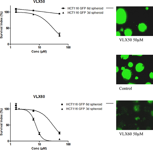Figure 3: Cell survival in the FMCA assay, expressed as survival index of cell lines cultured as 3-D spheroids for 3 or 6 days and then exposed to VLX50 (upper panel) or VLX60 (lower panel) for 72 h. Concentration-response curves (mean ± SEM) are based on three to six independent experiments with duplicate or triplicate wells for each concentration. Representative fluorescence images of 6 days spheroids exposed to VLX50, VLX60 and control are shown in the right panel. A concentration-response curve fitting was not possible for HCT116 GFP 6 days spheroids for VLX50 because of the configuration of the data.