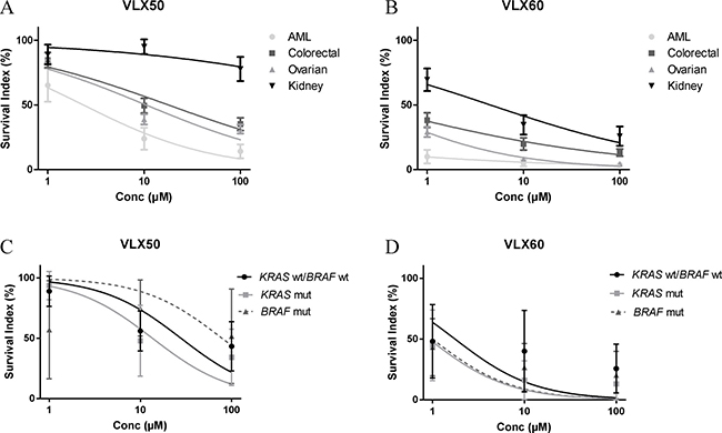Figure 4: Cell survival in the FMCA assay, expressed as survival index, of patient tumor cells representing the indicated diagnoses when exposed to VLX50 (A) or VLX60 (B) for 72 h. Concentration-response curves (mean ± SEM) are based on 7 to 26 samples, with duplicate wells for each drug concentration. AML, acute myeloid leukemia. (C–D) Antitumor activity of VLX50 and VLX60 in patient tumor cells from patients with colorectal cancer divided by KRAS and BRAF mutation status. IC50-values are shown in Table 2. KRAS and BRAF mutation status was available in 16 colorectal cancer patient samples, all investigated for both drugs (KRAS wt/BRAF wt, n = 6; KRAS mut, n = 7; BRAF mut, n = 3). Concentration-response curves show means ± SEM.