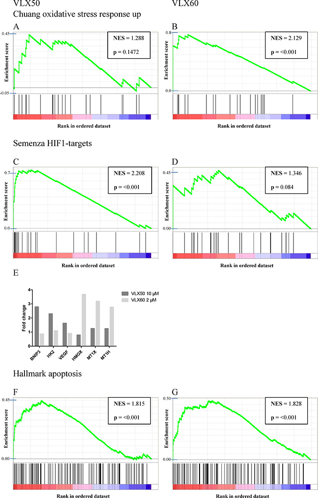 Figure 5: Gene set enrichment analysis. (A and B) Up-regulation of genes associated with oxidative stress. (C and D) Up-regulation of genes associated with hypoxia inducible factor 1 (HIF1) signaling. (E) Fold change of key genes in the HIF1 signaling pathway (BNIP3, HK2 and VEGF) and genes associated with oxidative stress (HMOX, MT1X and MTX1H) as evaluated by the GSEA. (F and G) Up-regulation of genes associated with apoptosis. Concentrations used were VLX50 10 μM and VLX60 2 μM. The genes are rank ordered according to their relative expression. Enrichment profiles (green lines) are shown of genes (black vertical lines) in each gene set (red = positively correlated; blue = negatively correlated). NES, normalized enrichment score. Individual genes included in the a priori defined gene sets are presented as supplementary material in the excel-files named “Supplementary Table 1 (VLX50 10 μM) and Supplementary Table 2 (VLX60 2 μM)”.