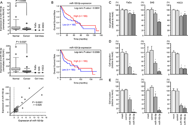 Our signature included several antitumor miRNAs (miR-375, miR-133a, and miR-1 etc.) that had been identified in human cancers in previous studies [32–40], suggesting that our present signature was effective for identification of novel oncogenic and antitumor miRNAs in HNSCC cells and may provide a benchmark for future studies of HNSCC. Interestingly, our present signature revealed that both strands of pre-miR-150, i.e., miR-150-5p and miR-150-3p were significantly downregulated in this signature. Our recent studies demonstrated that both strands of pre-miR-144 (miR-144-5p: guide strand and miR-144-3p: passenger strand) and pre-miR-145 (miR-145-5p: guide strand and miR-145-3p: passenger strand) inhibited cancer cell aggressiveness [41–43]. These findings suggested that passenger strand of miRNAs had antitumor function in several cancer cells. Therefore, we focused on miR-150-5p and miR-150-3p and investigated the antitumor functional of these miRNAs in HNSCC cells.