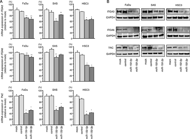 HNSCC cells were transfected with miRNA mimics for gain-of-function experiments and siRNAs for loss-of-function experiments. Pre-miR miRNA precursors (miR-150-5p, P/N: PM10070; miR-150-3p, P/N: PM12324; and negative control miR, P/N: AM17111; Applied Biosystems) were used in these assays. The following siRNAs were used in this study: stealth select RNAi siRNA, siITGA3 (P/N: HSS105531 and HSS179967; Invitrogen), siITGA6 (P/N: HSS179958 and HSS179959), and siTNC (P/N: HSS105145 and HSS105147). For transfection, RNAs were incubated with OPTI-MEM (Invitrogen) and Lipofectamine RNAiMax reagent (Invitrogen), as previously described [14, 32, 38, 50].