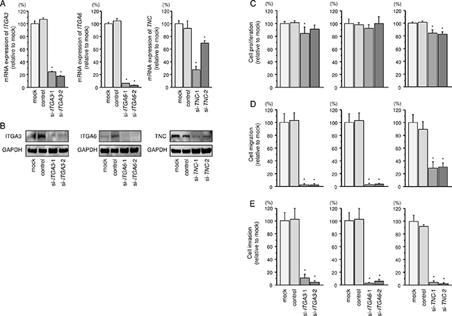Immunoblotting was performed with rabbit anti-ITGA3 antibodies (1:250 dilution, HPA008572; Sigma-Aldrich, St. Louis, MO, USA), anti-ITGA6 antibodies (1:500 dilution, HPA012696; Sigma-Aldrich), and anti-TNC antibodies (1:400 dilution, #sc-20932; Santa Cruz Biotechnology, Dallas, TX, USA); anti-glyceraldehyde-3-phosphate dehydrogenase (GAPDH) antibodies (1:1000 dilution, ab8245; Abcam, Cambridge, UK) were used as an internal control. The procedures were described in our previous studies [14, 32, 38, 50].