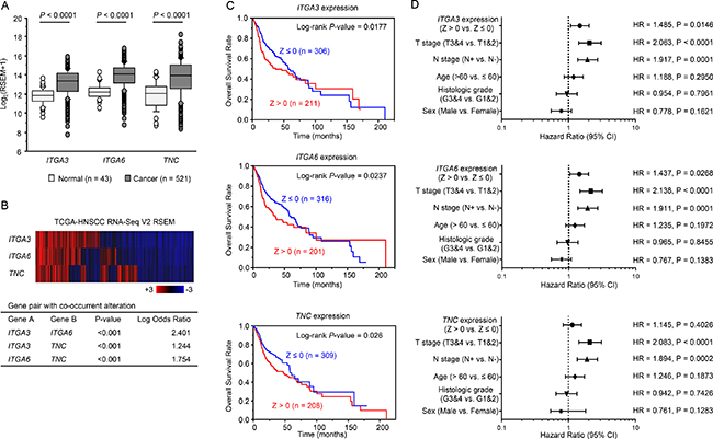 Figure 6: Clinical significance of three genes and miR-150-5p and miR-150-3p expression in HNSCC based on data from the TCGA database. (A) Comparison of ITGA3, ITGA6, and TNC mRNA expression levels between normal and tumor samples in TCGA database. (B) Heatmap visualization of gene expression based on TCGA-HNSCC RNA Seq data (Upper). All gene pairs among three genes expression pattern (mRNA Z-score > 0) showed significant co-occurrence by Fisher’s exact test (Lower). (C) Clinical outcomes in patients with altered miR-150-5p and miR-150-3p expression (CNV: amplification or gain, or mRNA: Z-score > 0) or without altered miRNA expression (CNV: diploid or het loss, and mRNA: Z-score ≤ 0), as displayed using Kaplan–Meier plots with log-rank tests. (D) Forest plot summarising hazard ratios. The X-axis displays the hazard ratio and 95% CI of each subgroup.