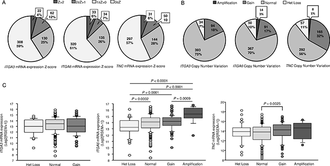 Next, to examine whether the expression levels of these genes predicted overall survival, patients were divided into two groups: Z-score > 0 and Z-score ≤ 0. Higher ITGA3, ITGA6, and TNC expression levels were associated with shorter overall survival (P = 0.0177, P = 0.0237, P = 0.026, respectively; Figure 6C). Details of mRNA expression z-scores are described in Figure 7A. The distributions of ITGA3, ITGA6, and TNC genomic copy number variations are shown in Figure 7B and 7C.