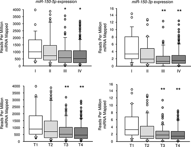 From the data of the TCGA database, the expression level of miR-150-5p and miR-150-3p were extracted for each TNM stage and T stage. The expression level of miR-150-5p and miR-150-3p was significantly decreased in advanced cases. The expression level of miR-150-5p and miR-150-3p were significantly decreased in advanced T stage cases (Figure 8).