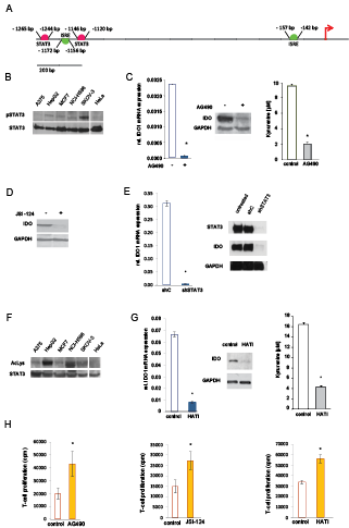 Figure 2: STAT3 mediates constitutive IDO1 expression in vitro. A, Cartoon of the human IDO1 promoter showing two STAT3 binding sites (pink) and two interferon-sensitive response elements (ISRE, green) upstream of the transcription start site. B, Western blot of STAT3 phosphorylation in indicated cell lines. STAT3 served as loading control. C, IDO1 mRNA, IDO protein and kynurenine release of SKOV-3 cells after 24 h (mRNA) or 48 h (protein and kynurenine) of treatment with 100 µM AG490. D, IDO protein and kynurenine realease of SKOV-3 cells analyzed after 24 h treatment with 1 µM JSI-124. E, IDO1 mRNA and IDO protein 72 h after STAT3 shRNA in SKOV-3 cells in comparison to control. F, Immunoprecipitation of STAT3 of indicated cell lines. Acetylation of lysine residue 685 of STAT3 was analyzed using western blot. STAT3 served as loading control. G, IDO1 mRNA, IDO protein and kynurenine release of SKOV-3 cells, analyzed 24 h (mRNA) or 48 h (western blot and HPLC) after treatment with 20 µM HATI. H, Mixed leukocyte reactions (MLR) on top of 2000 SKOV-3 cells, which were pre-treated with 100 µM AG490, 1 µM JSI-124 or 20 µM HATI for 2 days before addition of the MLR in comparison to controls. Asterisk indicates p<0.05, error bars indicate s.e.m.