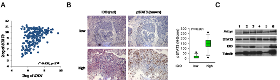 Figure 3: STAT3 mediates IDO1 expression in vivo. A, Correlation of IDO1 and STAT3 expression in B-cell lymphoma [27]. B, Left: Representative immunohistochemical stainings of p-STAT3 (brown) in NSCLC metastasis tissue with low or high IDO expression. Magnification: 100x. Right: Plot of pSTAT3 staining in NSCLC metastasis with low or high IDO expression (n=27). C, Left: Immunoprecipitation of STAT3 of 6 different IDO-positive NSCLC tissue lysates. Acetylation of lysine residue 685 of STAT3 was analyzed by western blot. STAT3 served as loading control. IDO protein expression was confirmed by western blot.