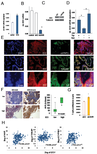 Figure 6: IDO sustains its expression via an autocrine AHR-IL-6-STAT3 loop. A, IDO1 mRNA in NCI-H596 cells after addition of 30 µM kynurenine (KYN) to tryptophan-starved cells, analyzed after 24 h by qRT-PCR. B, IDO1 transcript in SKOV-3 cells with a stable AHR knockdown (shAHR) in comparison to controls (shC and untransfected cells). C, IDO protein 72 h after siAHR in NCI-H596 cells. D, IDO1 mRNA in SKOV-3 cells cultured in the presence of tryptophan (Trp), in the absence of Trp and kynurenine (Kyn) and in the presence of Kyn for 120 h measured by qRT-PCR. E, Immunofluorescence of IDO (red), TIPARP (green), pSTAT3 (green), IL-6 (green) and DAPI (blue) in NSCLC, magnification: pSTAT3, TIPARP 200x, IL-6 400x. F, Left: Representative immunohistochemistry of IDO (red) and AHR (brown) in NSCLC metastasis tissue with low or high IDO expression. Magnification: 100x. Right: Plot of AHR expression (H-score) in NSCLC tissue with low or high IDO expression (n=27) G, Mixed leukocyte reactions (MLR) on top of 2000 SKOV-3 cells with a stable knockdown of AHR (shAHR) or control (shC). H, Correlation between IDO1 and AHR, TIPARP or CYP1B1 expression in B-cell lymphoma [27]. Asterisk indicates p<0.05, error bars indicate s.e.m