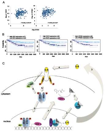 Figure 7: Influence of the AHR-IL-6-STAT3-IDO signaling loop on survival. A, Correlation of STAT3 and CYP1B1 with IDO1 in 204 patients with stage I-II lung adenocarcinomas [28]. B, Survival probability of patients with lung adenocarcinomas with high or low IDO1, STAT3 or CYP1B1 expression. C, The IDO-AHR-IL-6-STAT3 signaling loop: In the cytoplasm, IDO metabolizes tryptophan to kynurenine (kyn). 1: Kyn activates the AHR. The AHR translocates into the nucleus (2), where it dimerizes with ARNT and binds to dioxin responsive elements (DRE) in the promoter of target genes like IL-6. 3: IL-6 is released from the cells and binds to its receptor (4). 5: Upon activation of the IL-6 receptor, Janus Kinases (JAK) phosphorylate (P) STAT3. Simultaneously, histone acetyltransferases (HAT) acetylate STAT3. Phosphorylated and acetylated STAT3 dimers translocate into the nucleus (6), where they bind to the promoter of target genes like IDO1 (7).