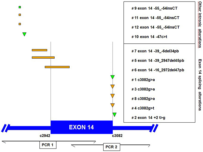 Somatic mutations of the MET gene have been described in non-small cell lung cancers (NSCLC) as new promising targets for small-molecule kinase inhibitors and monoclonal antibodies targeting MET or its ligand. Amongst mutations associated with oncogenic activation that are actionable by targeted therapies, those affecting exon 14 splice sites have been recently described [1, 2]. Patients may thus be screened on a routine basis and then be treated with MET inhibitors like crizotinib [3] as appropriate. However, the diverse compositions of the MET exon 14 splice sites and their variable locations in intronic regions require the examination of large and new sequences by high-throughput sequencing or genotyping technologies using formalin-fixed paraffin-embedded (FFPE) tumor samples.