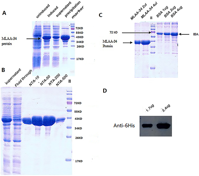 Figure 2: Expression and purification of MLAA-34 in E.coli. (A) SDS-PAGE to show induced and soluble MLAA-34 expression. (B) SDS-PAGE to show the purified MLAA-34 protein. *NTA-10/50/200/500 were 10/50/200/500 different concentrations of eluted imidazole. (C) SDS-PAGE to show the concentration and purity of the purified protein; the protein concentration was 1.7 mg/ml and the purity was 92%. (D) Western blot to identify the purified MLAA-34 protein.