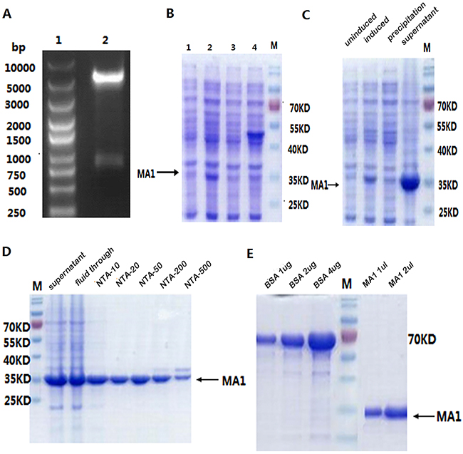 Figure 3: Expression and purification of MA1 in E.coli. (A) Analysis of the plasmid by double digestion. Lane 1: DNA marker; Lane 2: two bands generated by double digestion with BamHI and XhoI. The large band is the vector and the small band is the target DNA MA1 831 bp. (B) SDS-PAGE to show MA1 expression condition. Lane 1: total bacterial lysate (not induced); Lane 2: total bacterial lysate (0.5 mM IPTG induced for 4 h, 30°C); Lane 3: total bacterial lysate (0.5 mM IPTG induced for 4 h, 37°C); Lane 4: total bacterial lysate (1 mM IPTG induced for 4 h, 37°C). (C) SDS-PAGE to show induced and soluble MA1 expression. (D) SDS-PAGE to show purified MA1 protein. *NTA-10/20/50/200/500 were 10/20/50/200/500 different concentrations of the eluted imidazole. (E) SDS-PAGE to show the concentration and purity of the purified protein; the protein concentration was 1 mg/ml and the purity was over 95%.