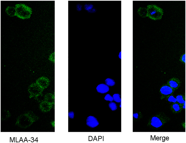 In conclusion, we have successfully expressed and purified MLAA-34 protein and isolated a fully human ScFv antibody (MA1) against MLAA-34 from a large human ScFv library. MA1 had good binding affinity and specificity for MLAA-34-positive U937 cells. This work lays a foundation for the development of anti-MLAA-34 antibody drugs. MA1 could be used as a candidate for AML-M5 antibody-based targeted therapy.