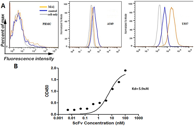 Figure 5: Binding specificity and affinity of MA1 to U937 cells. (A) Flow cytometric analysis to show binding of MA1 to U937 cells. Anti-TNF-α ScFv was used as negative control. (B) ELISA analysis to show the affinity of MA1. The Kd was calculated using nonlinear regression analysis of a one-site binding hyperbola equation in GraphPad Prism 5.0 software.