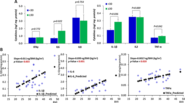Figure 1: Inflammatory status in the mammary tissue of women with different BMIs. (A) Comparisons between obese subjects (BMI ≥ 30 and subjects with BMI < 30. (B) The correlations between the expression of inflammatory cytokines and BMI. Data are represented as mean ± SEM.