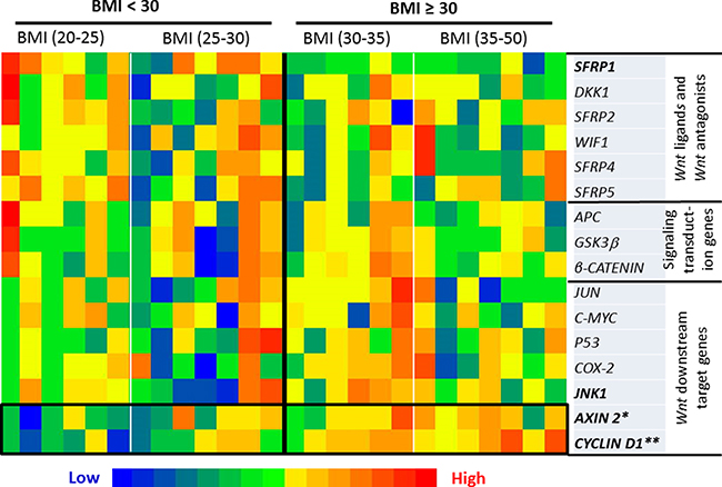 Figure 2: Heatmap of the transcriptional expression of Wnt pathway-specific genes. When a comparison was made between the subjects with BMI < 30 vs BMI ≥ 30, the expression was significantly up-regulated for CYCLIN D1 (p < 0.01) and AXIN 2 (p < 0.05), with marginal decrease of the expression for SFRP1 (p = 0.0578) and increase for JNK1 (p = 0.0582) for the individuals with BMI ³ 30. Significance was accepted when p < 0.05 with a False Discovery Rate cutoff of q ≤ 0.25 applied for multiple comparison.