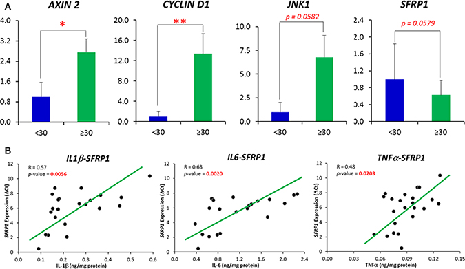 Figure 3: (A) Comparisons of Wnt pathway specific-genes whose expression was demonstrated to be significantly and marginally different between obese subjects (BMI ≥ 30) and individuals with BMI < 30. (B) Correlations between inflammatory cytokines (IL1β, IL6 and TNFα) with the expression of SFRP1 gene. Correlations were displayed between those inflammatory cytokines and the DCt of SFRP1 gene. The ΔCt, other than the relative expression, follows a normal distribution. A high ΔCt indicates a low expression of the gene. Data are represented as mean ± SEM.