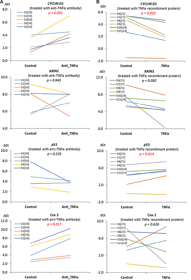 To evaluate whether there is a causal relationship between elevated inflammatory cytokines and Wnt-signaling, in the explant study (Exp. II), we treated fresh mammary tissues with anti-TNF-α antibody or TNF-α recombinant proteins. We assumed mammary tissue from obese women might have an elevated level of inflammation, whereas mammary tissue from women with BMI < 30 might have a low level of inflammation. Therefore, we treated samples from obese women with anti-TNF-α antibody but treated samples from women with BMI < 30 with TNF-a recombinant proteins, with the intention to detect the impact of TNF-α, which otherwise might not be detected if opposite treatments were applied. The expression of Wnt-signaling pathway downstream genes was subsequently meaured. We found that treatment with anti-TNF-α antibody for those mammary tissues from women with BMI ≥ 30 diminished the expression of CYCLIN D1 and COX2 (p < 0.05) in obese individuals, whereas treatment with TNF-α recombinant protein in samples from individuals with BMI < 30 significantly increased CYCLIN D1 expression (p < 0.05) and marginally increased AXIN2 expression (p = 0.082), but decreased P53 expression (p < 0.05) (Supplementary Table 2). The change in the expression of Wnt target genes in individuals under each treatment condition is shown on Figure 4 and the detailed relative expression and significances are shown in Supplementary Table 2. Note that, in Figure 4, a high DCt indicates a low expression of the gene.