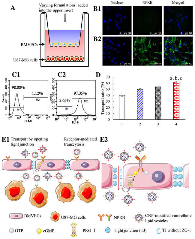 Figure 2: Transport across the co-cultured BBB. Notes: (A) in vitro co-culture BBB model. (B) NPRB expression in BMVECs is identified by confocal laser scanning microscopy; (B1) isotope control; (B2) anti-NPRB antibody. (C) NPRB expression in BMVECs is identified by flow cytometry; (C1) isotope control; (C2) anti-NPRB antibody. (D) transport across the BBB followed by killing of glioma cells; 1, free vinorelbine; 2, vinorelbine lipid vesicles; 3, CNP-modified vinorelbine lipid vesicles pretreated with Rp-8-CPT-cGMPS; 4, CNP-modified vinorelbine lipid vesicles. p < 0.05, a, vs. 1; b, vs. 2; c, vs. 3. Data are the mean ± standard deviation (n = 3). (E) CNP-modified vinorelbine lipid vesicles transporting across the BBB (schematic); E1, normal view; E2, enlarged view.