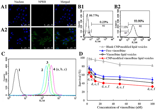 Figure 3: Targeting uptake by brain glioma cells and cytotoxicity. Notes: (A) NPRB expression in U87-MG cells identified by confocal laser scanning microscopy; (A1) isotope control; (A2) anti-NPRB antibody. (B) NPRB expression in U87-MG cells identified by flow cytometry; (B1) isotope control; (B2) anti-NPRB antibody. (C) cellular uptake in U87-MG cells; 1, blank control; 2, free coumarin; 3, coumarin lipid vesicles; 4, CNP-modified coumarin lipid vesicles. p < 0.05, a, vs. 1; b, vs. 2; c, vs. 3. Data are the mean ± standard deviation (n = 3). (D) toxicity to U87-MG cells. p < 0.05, d, vs. blank control; e, vs. free vinorelbine; f, vs. vinorelbine lipid vesicles. Data are the mean ± standard deviation (n = 6).
