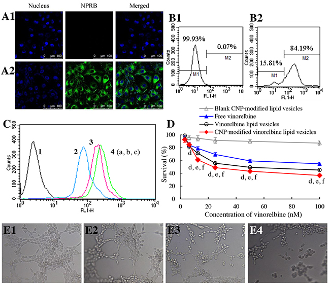 Figure 5: Targeting and disruption of glioma neovasculatures in vitro. Notes: (A) NPRB expression in HUVECs identified by confocal laser scanning microscopy; (A1) isotope control; (A2) anti-NPRB antibody. (B) NPRB expression in HUVECs identified by flow cytometry; (B1) isotope control; (B2) anti-NPRB antibody. (C) cellular uptake in HUVECs; 1, blank control; 2, free coumarin; 3, coumarin lipid vesicles; 4, CNP-modified coumarin lipid vesicles. p < 0.05, a, vs. 1; b, vs. 2; c, vs. 3. Data are the mean ± standard deviation (n = 3). (D) inhibitory effects on HUVECs. p < 0.05, d, vs. blank control; e, vs. free vinorelbine; f, vs. vinorelbine lipid vesicles. Data are the mean ± standard deviation (n = 6). (E) destruction of neovasculatures in vitro after treatment with various formulations; (E1) blank control; (E2) free vinorelbine; (E3) vinorelbine lipid vesicles; (E4) CNP-modified vinorelbine lipid vesicles.